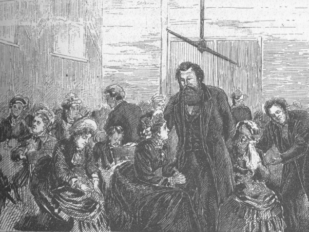 Sunday Up until Billy Sunday, altar calls were invitations for seekers to come to an after-meeting or inquiry room where counselors would help people understand their heart condition. These ministers worked in concert with the Holy Spirit to help seekers repent and yield to God, and to pray that God would save them. Someone was saved only when they were born again - when the Holy Spirit came into them. Conversion and being born again meant the same thing. If five to ten percent of the seekers were saved in an inquiry room meeting, the ministers were ecstatic and gave glory to God. Below is a scene from a typical inquiry room. D. L. Moody is the man in the foreground.